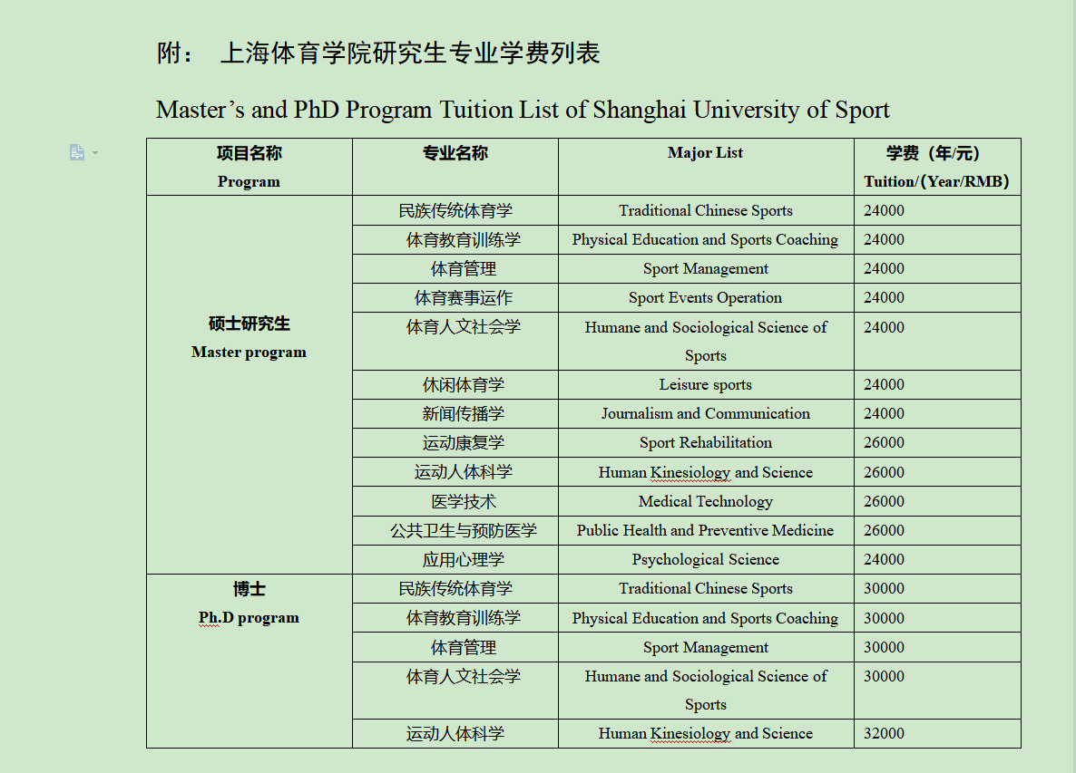 4. Master’s and PhD Program Tuition List of Shanghai University of Sport