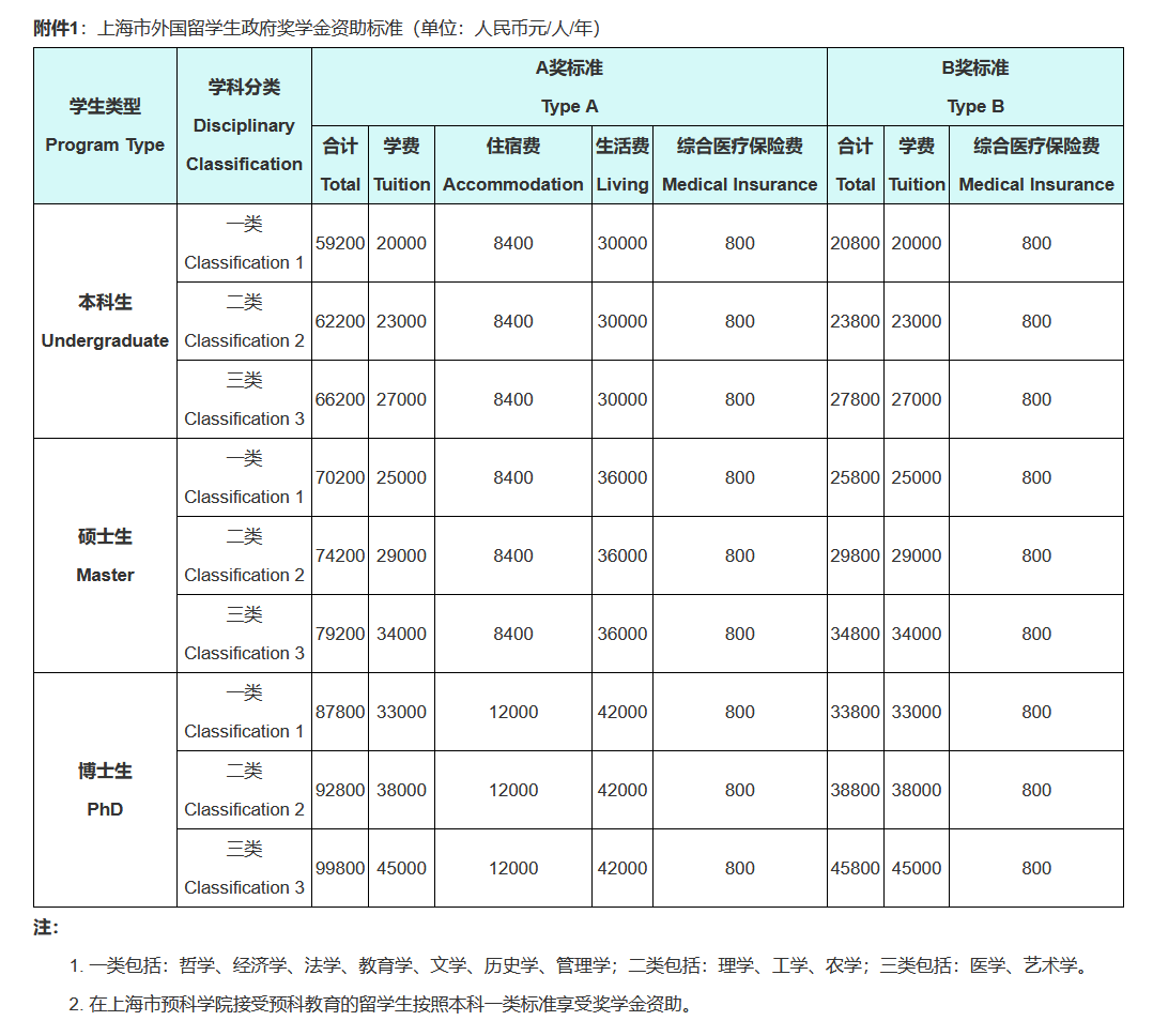 上海市外国留学生政府奖学金分为A、B两类。A类奖学金为全额奖学金,包含相应学制期间的学费、住宿费、生活费和综合医疗保险费,适用于本科、硕士、博士和本科预科阶段学习。B类奖学金为部分奖学金,包含相应学制期间的学费和综合医疗保险费,适用于本科、硕士、博士和本科预科阶段学习。